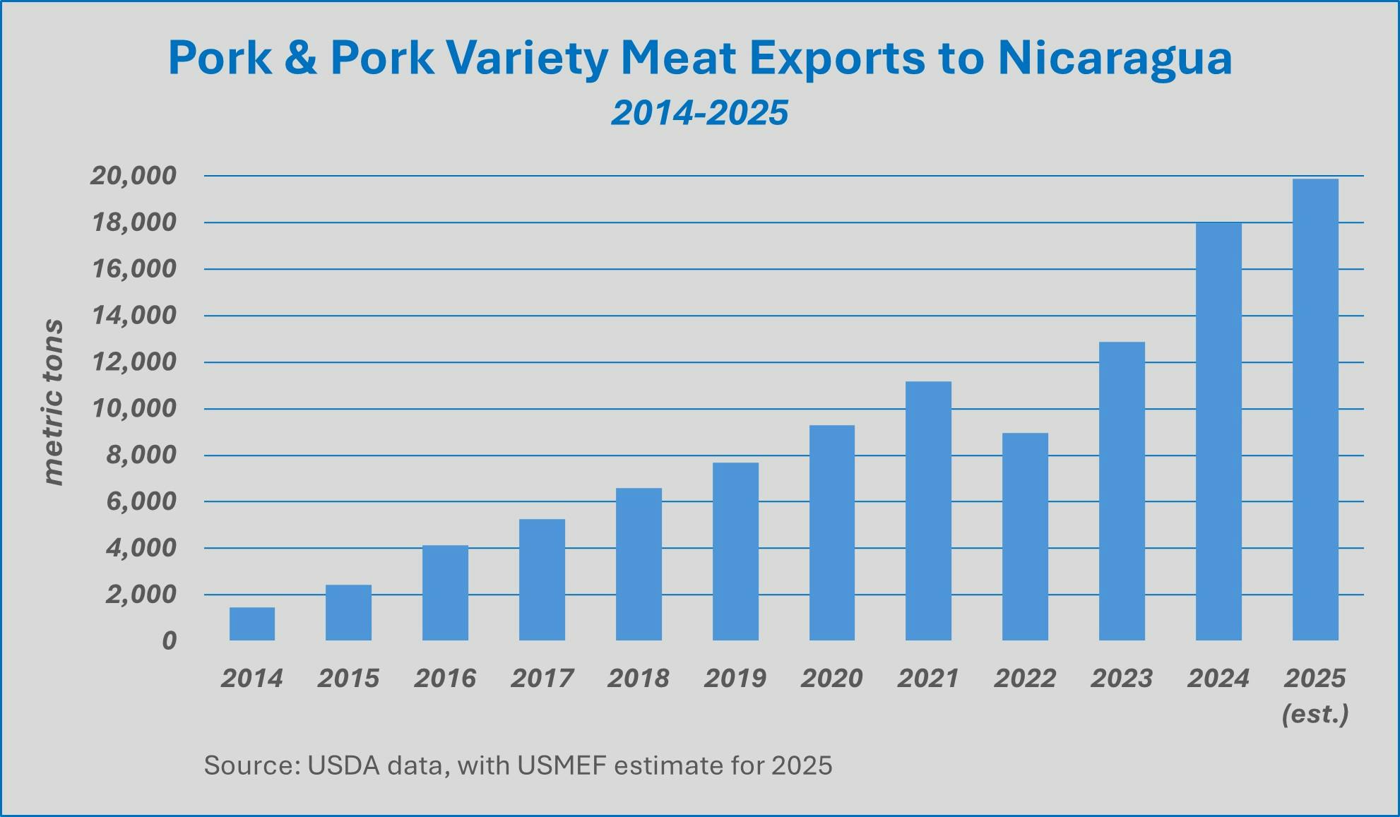 Duty-free access through CAFTA-DR has helped make Nicaragua a rapidly growing destination for U.S. pork, ranking 13th among all export markets this year. Exports will approach 20,000 mt in 2025, more than doubling over the past five years and up from less than 1,500 mt a decade ago. Export value is estimated at $68.5 million – up 180% since 2020.