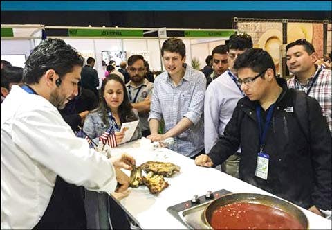 Importers visit the USMEF exhibit at the Espacio Food and Service Show to learn about the quality of U.S. pork and beef