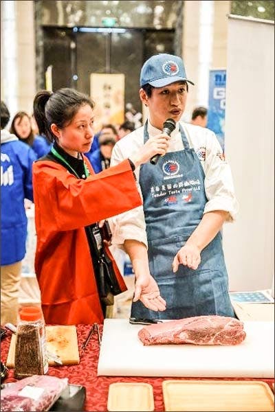 A chef at QiMin, a Taiwanese catering company with three outlets in Shanghai, poses with U.S. beef cuts at a hotpot event celebrating the company’s one-year anniversary of serving U.S. beef