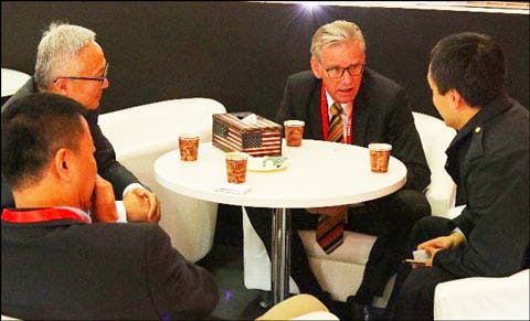 Joel Haggard, USMEF senior vice president for the Asia Pacific, meets with buyers at the USMEF booth at Food and Hotel China