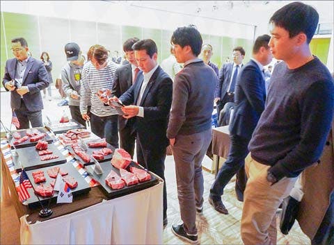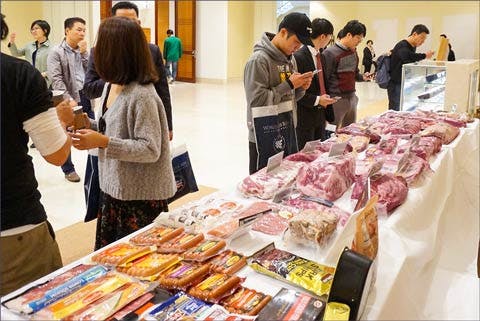 Foodservice distributors and suppliers check out U.S. pork and beef items at a U.S. meat seminar on South Korea’s Jeju Island