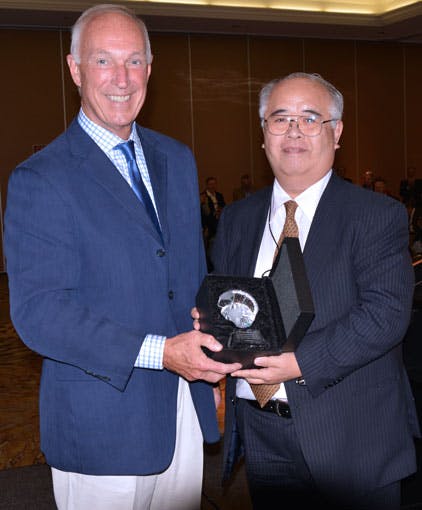 USMEF President and CEO Philip Seng, left, presents Susumu “Sam” Harada with an award recognizing Harada’s service with USMEF