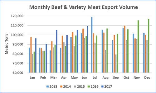 June beef exports were the largest of 2017, reaching 109,554 metric tons (mt) – up 11 percent year-over-year and the largest June total since 2011. Export value increased 10 percent to $602.5 million. For January through June, beef exports were up 12 percent in volume (606,876 mt) and 15 percent in value ($3.35 billion) compared to the first half of last year.