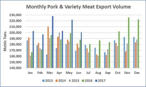 Pork exports totaled 200,229 mt in June, up 6 percent year-over-year and the largest June volume on record, valued at $527.1 million, up 4 percent. This pushed the first-half total to 1.25 million mt valued at $3.21 billion – up 13 percent and 16 percent, respectively.