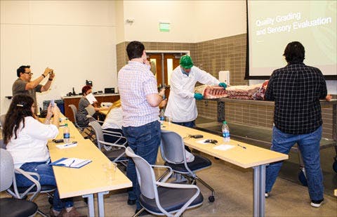 Members of the Mexico media team participate in a U.S. red meat cutting demonstration at Colorado State University