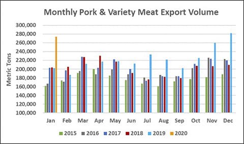 Following a record-breaking performance in 2019, U.S. pork exports maintained a torrid pace in January, according to data released by USDA and compiled by USMEF. January beef exports were also higher year-over-year, while exports of U.S. lamb trended lower.