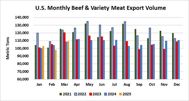 While beef exports to South America have trended lower in 2025, leading market Chile is a notable exception. March shipments to Chile surged to 810 mt, up 161% from a year ago, valued at $5.6 million (up 155%). First-quarter exports to Chile increased 41% to 2,021 mt, while value soared 77% to $14.1 million. Beef variety meat exports to Chile, mostly livers and tripe, are on a record pace at 1,173 mt, up 47% from last year.