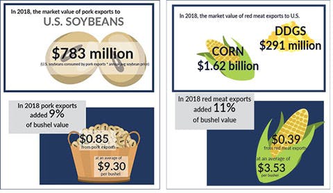 The updated study also looks forward, projecting that U.S. pork exports are expected to generate $8.68 billion in market value to soybeans from 2019 to 2028. Red meat exports are expected to generate $19.1 billion in market value to corn and $3.1 billion in market value to distiller's dried grains with solubles (DDGS) in that same period.