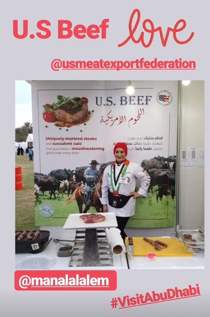 Manal Alalem, a local chef and food blogger, posted a photo of herself in front of a U.S. beef banner at World of Food Abu Dhabi