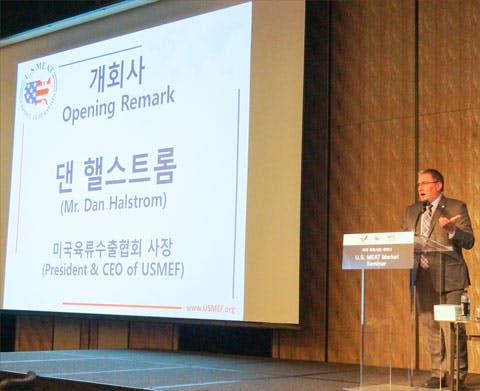 USMEF President and CEO Dan Halstrom addresses attendees at the U.S. Meat Market Seminar in Seoul
