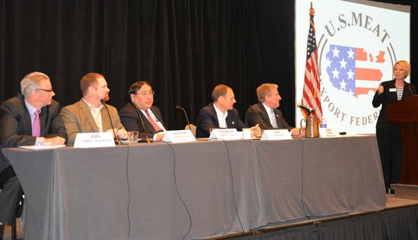 - Greg Ahart addresses market access issues for U.S. lamb in a panel discussion with (from left) Cattlemen’s Beef Board CEO Polly Ruhland, National Pork Board CEO Chris Hodges and USMEF Chair Leann Saunders