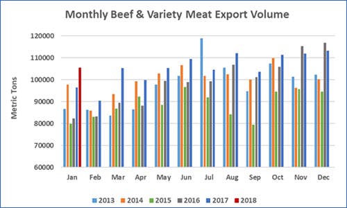 - Exports to South Korea, which reached a record $1.2 billion in 2017, increased 13 percent from a year ago to 17,133 mt, while export value soared 34 percent to $122.3 million. This included a 54 percent increase in chilled beef exports to 3,954 mt, valued at $36.9 million, up 63 percent. Through the Korea-U.S. Free Trade Agreement (KORUS), the duty on U.S. beef was reduced to 21.3 percent on Jan. 1, about 5 percentage points lower than Australia’s rate for this year and down significantly from the pre-KORUS rate of 40 percent.