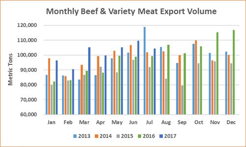 - After a slow start in 2017, beef exports to Hong Kong continue to rebound. Exports were up 13 percent year-over-year in volume (65,379 mt) and 21 percent higher in value ($417.8 million). July was the first full month for exports to China, as exports totaled 137 mt valued at $1.3 million.