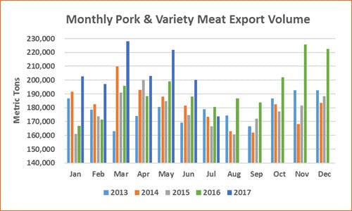 Pork exports totaled 173,675 mt in July, down 4 percent year-over-year, valued at $488.9 million, down 0.6 percent. January-July volume was still up 11 percent from a year ago to 1.43 million mt, while export value was up 13 percent to $3.7 billion.