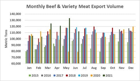 - Beef exports to Mexico – a critical destination for rounds and other underutilized muscle cuts, as well as beef variety meat – increased 15% from a year ago in volume (99,621 mt) and 22% in value ($481.3 million). The increase was due in part to a resumption in foodservice demand, including from the travel and tourism sector.