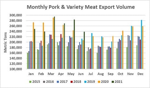 - While China/Hong Kong remains the largest destination for U.S. pork exports in 2021, first-half exports were down 22% from a year ago in both volume (471,565 mt) and value ($1.1 billion). Exports to China/Hong Kong accounted for just under 30% of total U.S. export volume, after reaching 39% in the first half of 2020. Although demand for muscle cuts has declined with the drop in China's hog prices, U.S. pork variety meat exports to China increased by 25% in the first half, reaching 166,809 mt. Export value climbed 30% to $408.7 million.