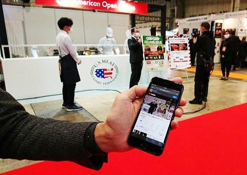 USMEF’s Tatsuru Kasatani live streams from the USMEF booth at the Supermarket Trade Show in Japan
