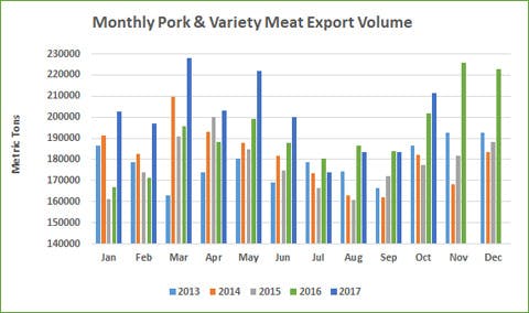- Pork exports to Mexico moderated slightly in November but remain poised for a sixth consecutive volume record in 2017. Through November, volume was up 12 percent from a year ago to 726,717 mt, while export value increased 15 percent to $1.37 billion. Mexico is a critically important destination for U.S. hams, especially with the current high level of U.S. hog production.